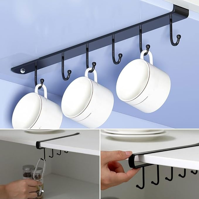 Mugs and utensils are orderly organized by under cabinet hooks rack. Space saving for countertop, keep it neat and tidy.Easy to install, just slide in and hang your mugs. No drilling & Free Damage.
