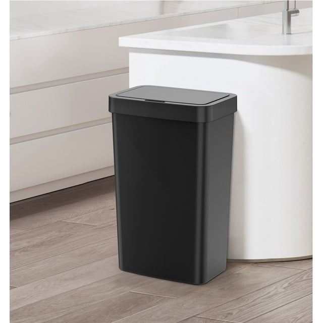 The 13.2 Gallon Plastic Motion Sensor Trash Can is perfect for large families or busy environments. The touchless operation allows for improved cleanliness and hygiene, this trash can operates with hands-free motion sensing technology. Simply wave your hand above the sensor at the front of the lid to open it automatically. The creative lighting system counts down to the soft close of the lid for a quiet user experience. Perfectly sized to accommodate any standard 13-gallon trash can liner, this durable plastic resin garbage can also features soft touch buttons for manual operation. The rectangular design and all black finish makes this the ideal garbage can for use in the kitchen, office, laundry room or any other area of the house.