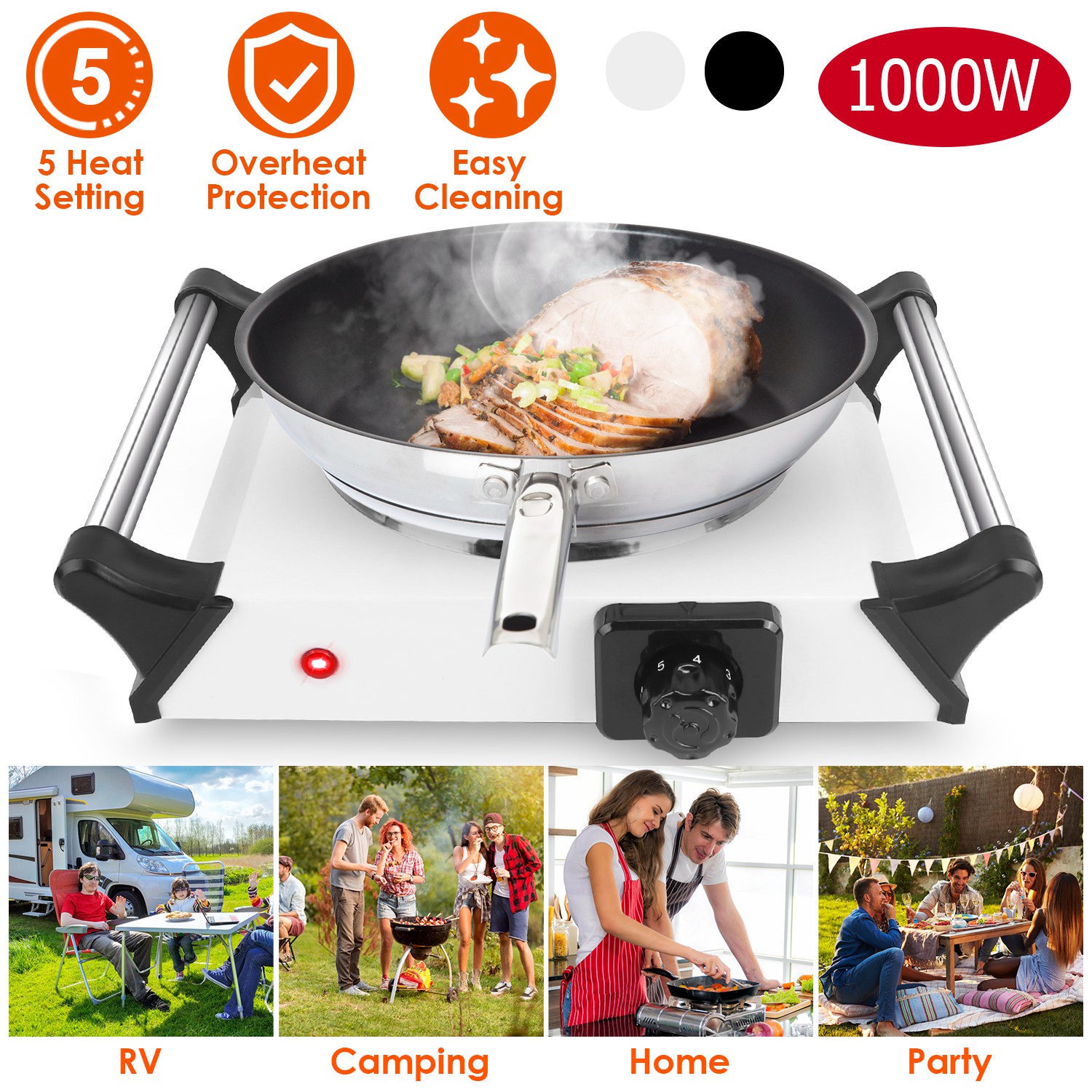 Compact design is great for events and traveling! It\'s portable and makes it easy to cook anywhere with access to a power outlet. The lightweight and compact design makes for easy traveling and storage. The coiled burner design distributes heat evenly for great performance at 5 temperature levels. It\'s perfect for camping, student accommodation, holiday homes, caravans, campers, offices or as an extra cooking surface in a busy kitchen. A sleek clean white/black finish adds style and a sleek appearance to this wonderful kitchen addition!