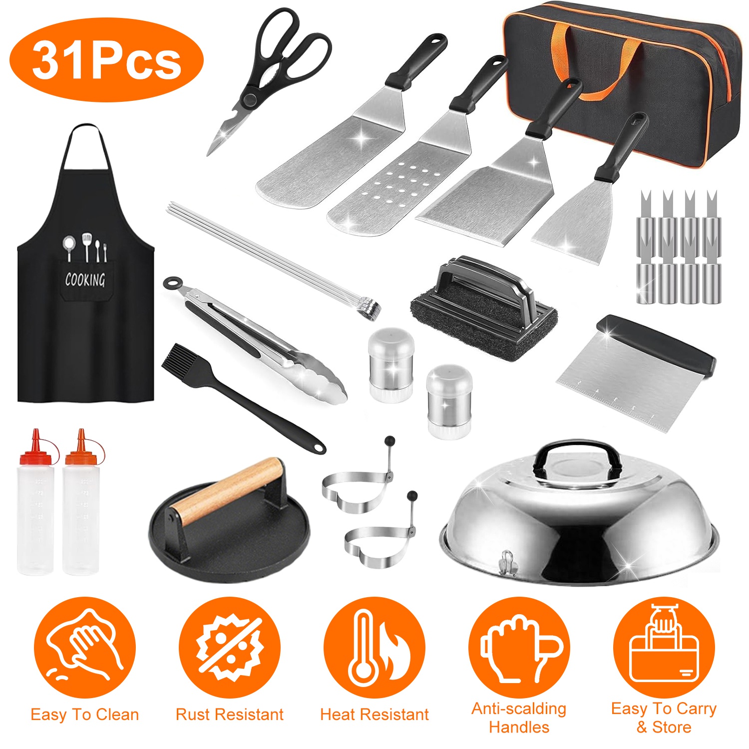This 31Pcs griddle accessories kit includes everything you need for your griddle cooking, an perfect gift for anyone who loves to cook, whether they are a professional griller or a weekend BBQ enthusiast. Ideal for birthdays, housewarmings, or special occasions, this set adds both function and fun to the kitchen or grill. The handles are anti-scalding. Constructed with food-safe and sturdy materials, easy to clean. Include a large storage bag to keep everything neatly organized and easily accessible, whether you\'re storing your accessories at home or taking them on the go.